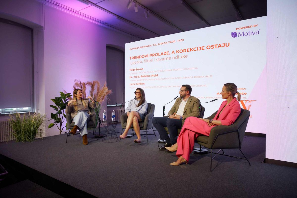 Koliko društvene mreže oblikuju način na koji danas doživljavamo vlastito tijelo bila je tema panela „Trendovi prolaze, a korekcije ostaju: ljepota, filteri i stvarne odluke“ powered by EDC MOTIVA. O odnosu između digitalnih trendova, percepcije ljepote i medicinske odgovornosti govorili su Filip Bosna, general manager za EMEA distributerska tržišta, dr. med. Rebeka Held, plastična i estetska kirurginja i osnivačica Poliklinike dr. Rebeka Held, te Lena Mrđen, Business Unit Manager u tvrtki Orbico Croatia i voditeljica podcasta GEN B.