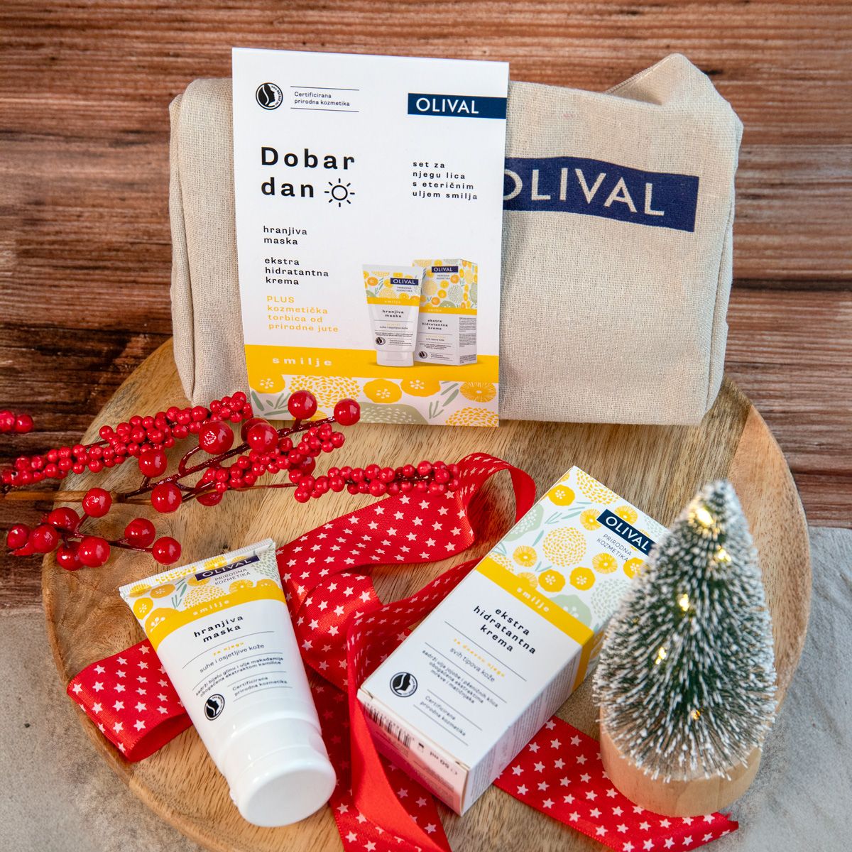 Set Dobar dan sadrži Ekstra hidratantnu kremu Smilje i Hranjivu masku Smilje koja je namijenjena njezi suhe i osjetljive kože lica te gratis poklon - kozmetičku torbicu od prirodne jute.
