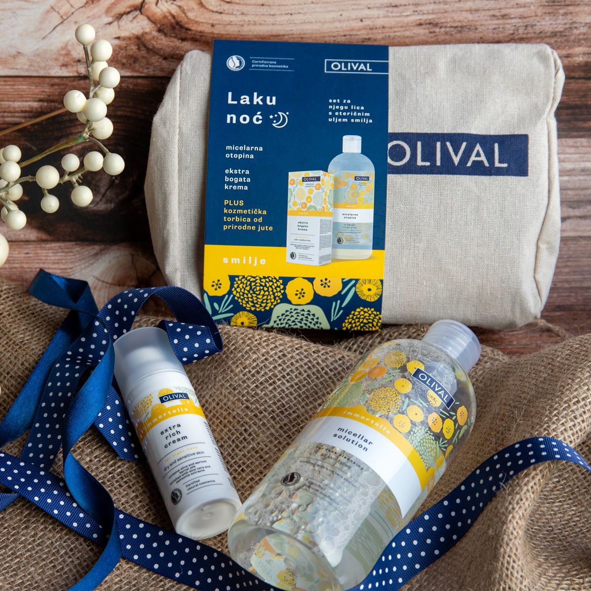 Set Laku noć kreiran je kako bi olakšao osnovne potrebe kože kada je u pitanju večernja rutina - čišćenje i njega te sadrži Micelarnu otopinu Smilje i Ekstra bogatu kremu Smilje također uz kozmetičku torbicu od prirodne jute.